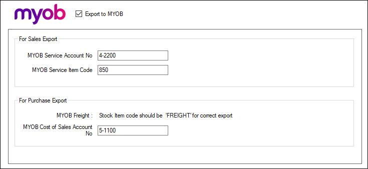 | MYOB Freight | If the item code is ‘FREIGHT’, this item will export to MYOB’s freight. |